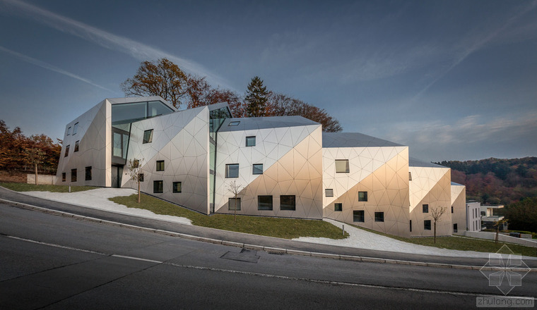根據(jù)城市建筑規(guī)章條例規(guī)范,無論地形有多奇怪,都可以建造簡易的兩層單體建筑,并且?guī)в械叵率?。但是,周圍的環(huán)境、特殊的地形條件和基地的形式造就了各種各樣的建筑,與此同時(shí)也產(chǎn)生了上文所指出的問題?;匚挥谝粭l十分彎曲的街道邊緣;地形高差達(dá)10米,非常陡峭;基地上保留有樹齡300年的古樹,且被列為國家歷史文物。所有的這些狀況使建筑有了最初的形狀。此外,該建筑還呼應(yīng)了特殊的城市環(huán)境(一邊是小體量的住宅單元,而另一邊是大體量的公寓樓。)建筑師通過將主體分成六個(gè)小的、垂直位移的體塊,創(chuàng)造了一個(gè)巧妙地轉(zhuǎn)變。建筑通過這種方法適應(yīng)了環(huán)境,既保持了所需的密度,又賦予其歸屬感、特性和人性化。體塊的分割和位移需要謹(jǐn)慎地研究自然采光的需求、朝向城市景觀的開闊視野,并且創(chuàng)造天地之間的視覺連接,同時(shí)還要保護(hù)住戶的隱私。
