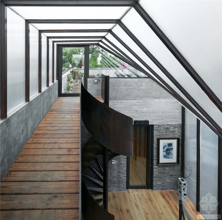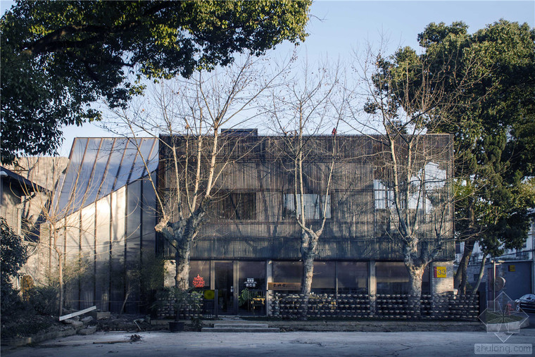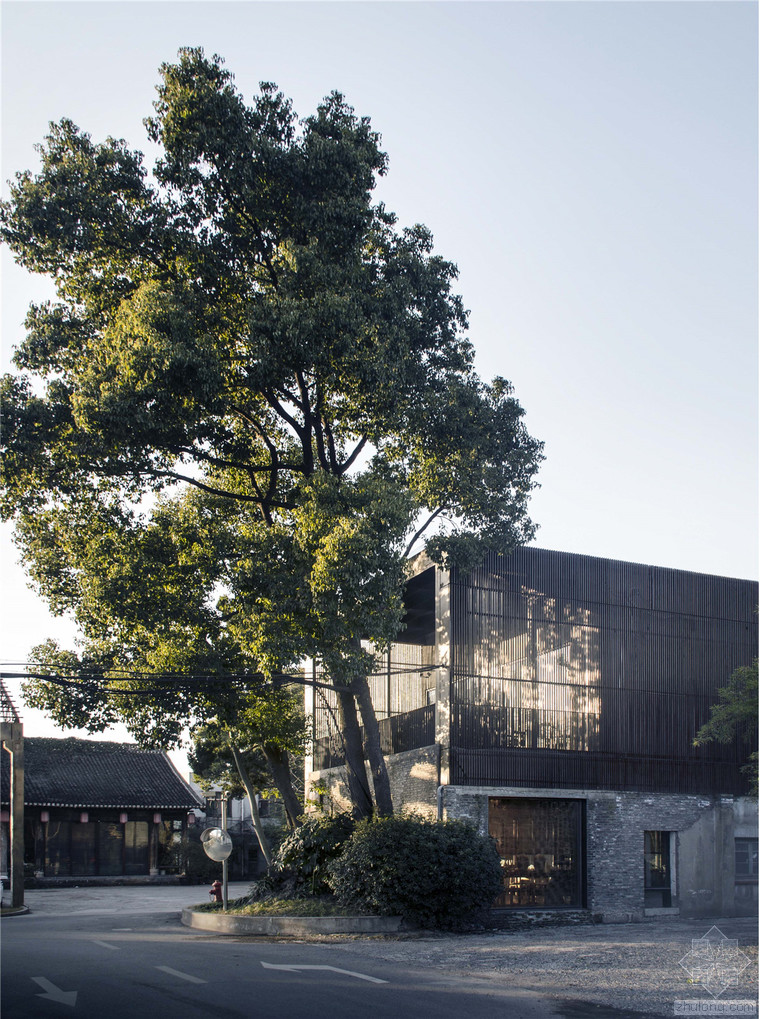 瓷語(yǔ)堂項(xiàng)目是對(duì)建筑原真性的一次回歸,我們希望通過(guò)一個(gè)最簡(jiǎn)單的手段介入場(chǎng)地,使得建筑物僅僅作為一個(gè)“存在”與基地發(fā)生關(guān)系,而不是通過(guò)美學(xué)加以評(píng)判。在面對(duì)場(chǎng)地現(xiàn)狀已經(jīng)存在的幾棟老建筑和一棵大樹,我們希望它們可以成為場(chǎng)地記憶的再現(xiàn),作為新建筑的一部分共同留存下去,而不是簡(jiǎn)單的粗暴拆除并由一個(gè)全新的物體所替代。通過(guò)合理的結(jié)構(gòu)布置和構(gòu)造處理,新房子輕巧的微微落于老墻之上,二者完整的融合在了一起,斑駁的老墻和由磚、木等樸素材料構(gòu)筑的新建筑自然而然的和諧共生,而老墻的歲月留下的痕跡亦為建筑提供了不可復(fù)制的特征。場(chǎng)地上的大樹成為了我們南側(cè)的重要遮蔽,使得二層的露臺(tái)不會(huì)直接暴露在正對(duì)的一條小路前面,同時(shí)也為露臺(tái)貢獻(xiàn)了不同季節(jié)的多樣風(fēng)景和光影特質(zhì)。作為陶瓷藝術(shù)家展示、交流和工作的場(chǎng)所,空間的布置簡(jiǎn)潔而不失特點(diǎn),混凝土、青磚等樸素而帶有一點(diǎn)點(diǎn)粗糙質(zhì)感的材料與陶瓷藝術(shù)品相映成趣,建筑低調(diào)地成為了作品的背景。
