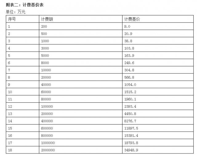 注:計(jì)費(fèi)基價(jià)詳見(jiàn)附表二《計(jì)費(fèi)基價(jià)表》,計(jì)費(fèi)額處于兩個(gè)數(shù)值區(qū)間的,采用內(nèi)插法確定設(shè)計(jì)計(jì)費(fèi)基價(jià);工程復(fù)雜程度調(diào)整系數(shù)詳見(jiàn)附表三《工程復(fù)雜程度調(diào)整系數(shù)表》