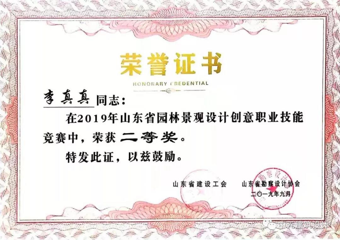 祝賀我公司李真真在2019年度山東省園林景觀設(shè)計(jì)創(chuàng)意職業(yè)技能競賽中獲得全省二等獎(jiǎng)的驕人戰(zhàn)績。為公司和個(gè)人贏得榮譽(yù)。